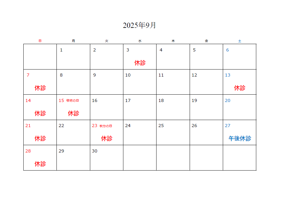 9月は、3日(水)、13日(土)は休診とさせていただきます。
